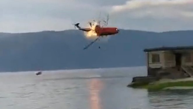 L'elicottero anticendio preleva acqua ma cade e si schianta