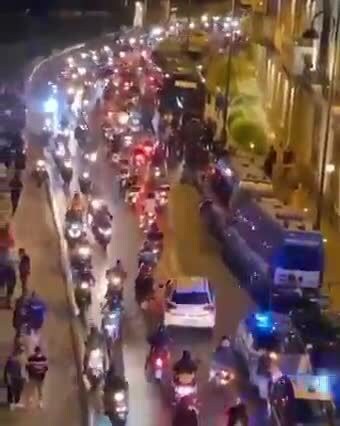 Sfilata di scooter, decine e decine, all'esterno dell'Hotel Britannique in corso Vittorio Emanuele, dove alloggia la Juventus, impegnata nella partita di campionato contro il Napoli. I centauri hanno suonato ripetutamente i clacson e urlato in direzione dei calciatori, creando anche qualche difficoltà alla circolazione degli altri veicoli.