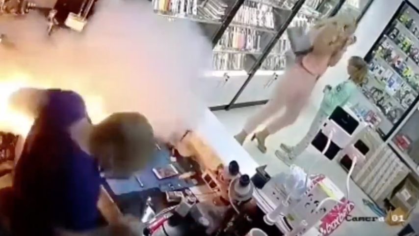 Il tecnico del negozio sta riparando la batteria di un cellulare che improvvisamente esplode. Fuoco e fiamme lo mettono in fuga e generano un grosso spavento a mamma e figlia che in quel momento si trovano lì.