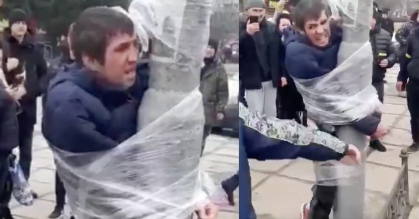In diverse città ucraine i cittadini hanno deciso di farsi giustizia da soli legando ai pali della luce i ladri colti in flagrante durante la guerra con la Russia. Qui un uomo, con i pantaloni abbassati, viene anche frustato con una cintura.
