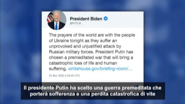 Il mondo riterrà la Russia responsabile Roma, 24 feb. (askanews) - Immediato il primo tweet del presidente degli Stati Uniti Joe Biden alla notizia dell'avvio di una 'operazione militare' in Ucraina. Un secondo tweet avverte: gli usa e gli alleati risponderanno. "Le preghiere del mondo sono con il popolo dell'Ucraina stasera mentre subisce un attacco non provocato e ingiustificato dalle forze militari russe. Il presidente Putin ha scelto una guerra premeditata che porterà sofferenza umana e una perdita catastrofica di vite" afferma il primo tweet. E il secondo: "La Russia è interamente responsabile per la morte e la distruzione provocate da questo attacco, e gli Stati Uniti e i loro alleati e partner risponderanno in modo deciso e unitario".