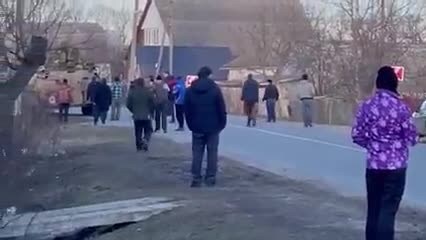 Un gruppo di civili si piazza in strada a Ichnya, nella regione di Chernihiv, dove i russi hanno ormai sfondato dopo l'invasione dalla Bielorussia. I locali disarmati hanno costretto l'equipaggio militare di due tank russi a cambiare rotta invece di procedere lungo la strada