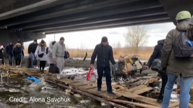 Sotto un ponte fatto saltare per fermare l'avanzata russa Roma, 11 mar. (askanews) - Un video girato da una giornalista locale mostra gli ucraini in fuga dall'invasione russa che cercano di guadare un fiume a Irpin, alle porte di Kiev, passando sotto un ponte fatto saltare dalle forze ucraine per fermare l'avanzata dei carri armati russi. Le autorità aiutano nella traversata, molti portano valigie e altri affetti personali.