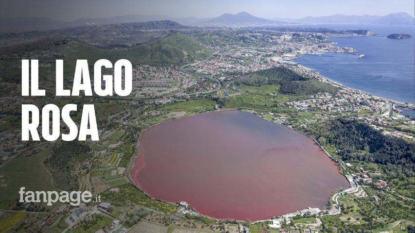 Il lago d'Averno (Napoli) si tinge di rosa per un'alga marina: le immagini dal drone
