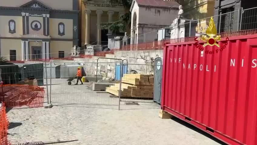 Dopo il crollo del 5 gennaio del 2022, sono cominciate oggi le operazioni di puntellamento e messa in sicurezza di parte dell'area del cimitero di Poggioreale interessata dal cedimento. Sul posto sei squadre dei vigili del fuoco.