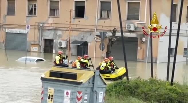 I vigili del fuoco evacuano le persone bloccate in casa Roma, 3 mag. (askanews) - Prosegue da 24 ore il lavoro dei vigili del fuoco per fronteggiare gli ingenti danni causati dal maltempo in Emilia Romagna: 600 finora gli interventi tra le province di Bologna, Ravenna e Forlì Cesena. Numerose le evacuazioni di persone bloccate in casa, raggiunte con i canotti grazie alle squadre di soccorritori fluviali. Nelle immagini le operazioni di soccorso a Faenza, una delle zone più colpite. Il presidente della Regione, Stefano Bonaccini, ha parlato di emergenza senza precedenti per la quantita d'acqua caduta in 48 ore. Due persone sono morte, una nel crollo di un'abitazione a Fontanelice, nell'imolese, a causa di una frana; un'altra travolta dall'acqua mentre era in bicicletta.