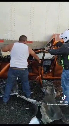 Le operazioni di salvataggio di un insegnante messicano che si è salvato miracolosamente dopo essere stato tamponato da un camion ed essere rimasto incastrato all'interno della sua auto sotto un altro camion.