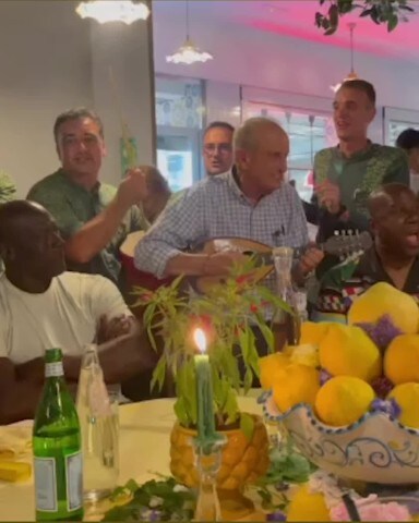 I due famosi cestisti e l'attore, in vacanza sull'isola di Capri, si sono ritrovati insieme a cena nel noto ristorante Da Paolino. Accompagnati da musicisti e camerieri, la combriccola si è prodotta in una personale interpretazione di "Nel blu dipinto di blu".