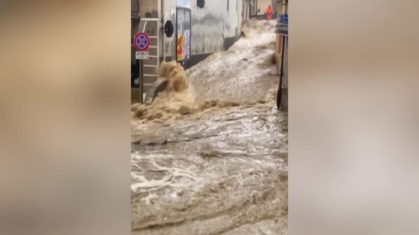 Una cascata d’acqua scorre lungo le strade di Rubiana, in Piemonte, dove le forti piogge hanno portato all'esondazione del torrente Messa.