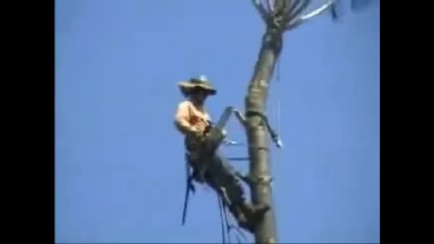 Disinvolto tree climber, questo signore deve avere sbagliato qualche mossa tagliando l'albero con la sega elettrica. La potatura si è trasformata in una avventura da brivido.