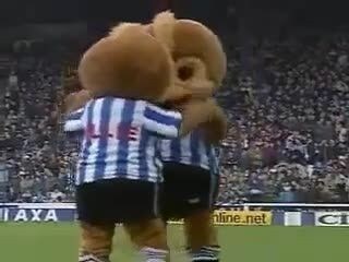 Non capita spesso di vedere balletti di questo tipo prima di una partita. E invece queste due mascotte intrattengono in questo simpatico modo il pubblico. Spettacolo puro prima del fischio d'inizio
