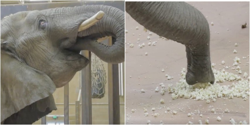 In occasione del National Popcorn Lover's Day, lo Zoo Toledo, in Ohio, ha festeggiato regalando popcorn a volontà a Renee, la loro storica elefantessa. Grazie ad un baule speciale, costruito appositamente per l'occasione, Renee ha potuto magiare i suoi tanto amati popcorn soffiando dentro dei tubi. Fonte Video: https://www.facebook.com/TheToledoZoo/?fref=photo
