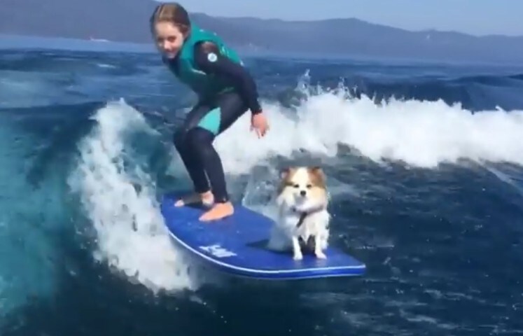 Sembra a suo agio questo cagnolino che sulla tavola da surf insieme alla sua padroncina, da sfoggio di una sicurezza invidiabile.