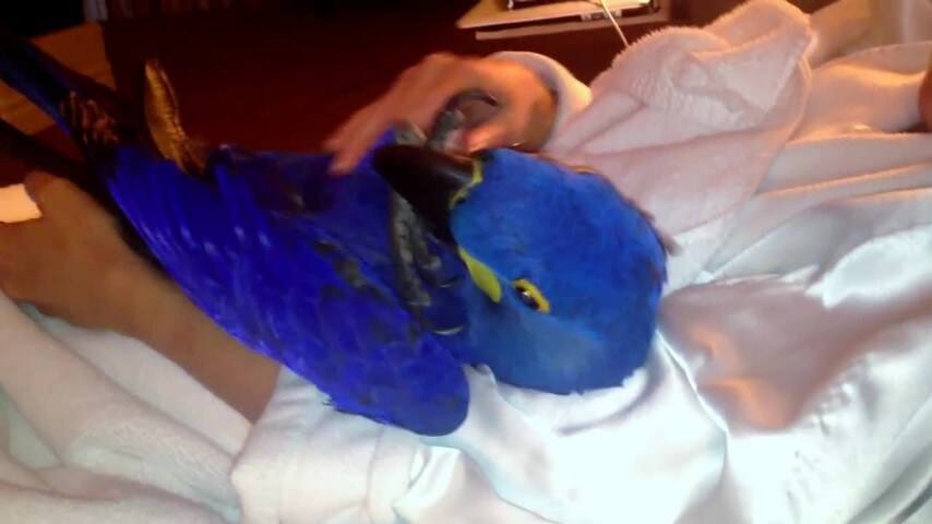 Carezze per il grosso pappagallo colorato che sembra apprezzare le attenzioni del padrone. Fonte: https://www.youtube.com/watch?v=JSGGw_rNfos