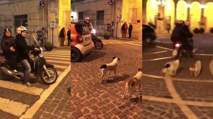 Due cani non permettono il passaggio dello scooter, i due ragazzi inventano uno stratagemma divertente per poter passare.