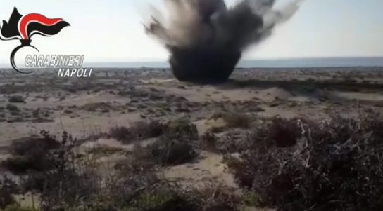 Caserta, in una villetta usata come laboratorio di botti illegali di Capodanno, i carabinieri hanno trovato un secchio da 25 kg di polvere da sparo, tanta da radere al suolo un intero quartiere. Arrestato un pregiudicato, la polvere esplosiva è stata fatta brillare lungo il litorale di Castel Volturno. Nel video il momento dell'esplosione.