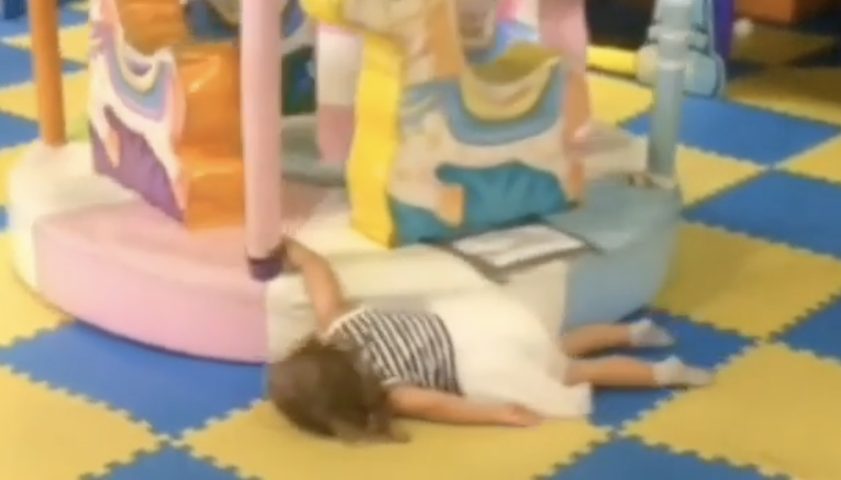 Questa simpatica bimba è talmente stanca che non vuole stare neanche sul cavallo della giostra. Allora ha un'idea divertente, lasciarsi trascinare e rilassarsi a terra.