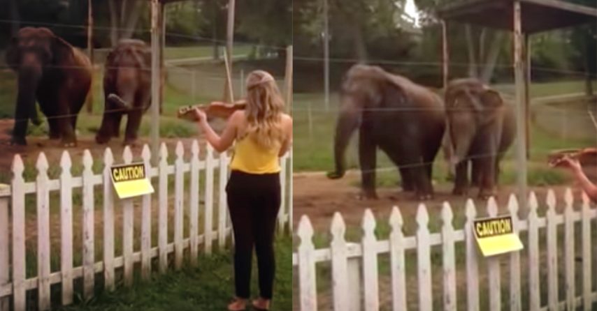 Questa violinista suona il suo strumento davanti a due elefanti che sembrano gradire, tanto da iniziare una sorta di ballo.