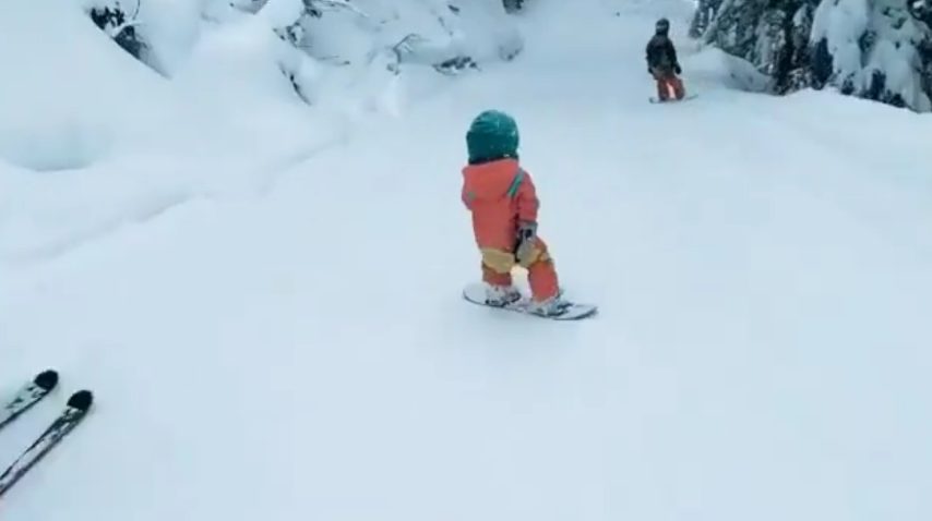 I genitori sono degli appassionati di snowboard e così hanno sin da subito insegnato al loro piccolo figlio ad andare sulla tavola scivolando sulla neve e lui sembra apprendere e divertirsi molto.