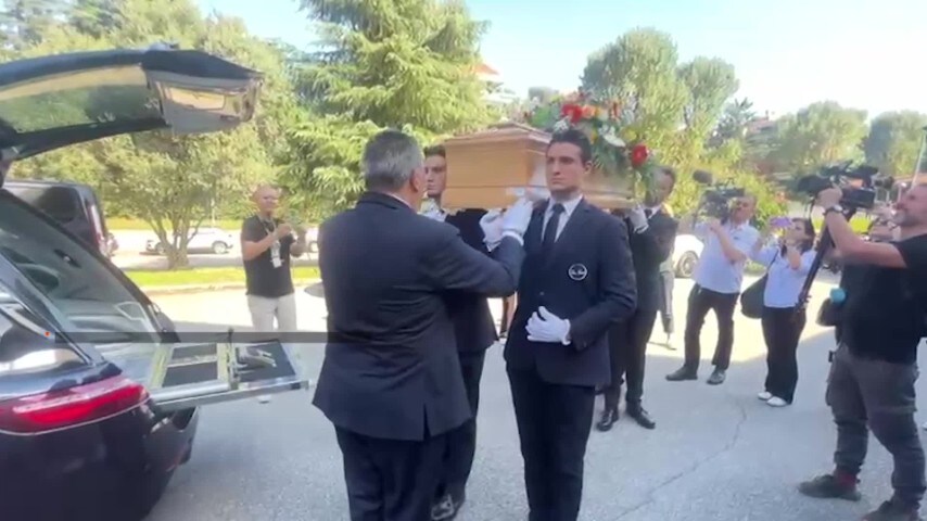 L'arrivo del feretro di Emilio Fede alla chiesa di Dio Padre a Segrate, Milano. Il giornalista è morto lo scorso 2 settembre all'età di 94 anni. L'ingresso in chiesa poco prima delle 16.