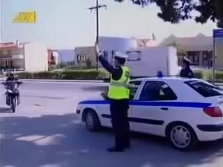 Simpatica scenetta che mostra un agente della polizia municipale che alza il braccio per fermare un motociclista che però invece di frenare, passa di fianco all'agente e "batte il cinque". Ovviamente è tutto uno scherzo.