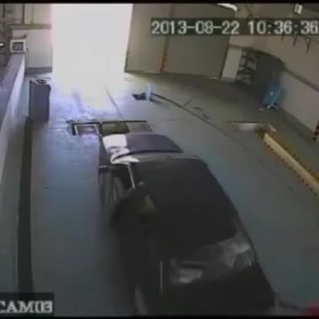 Devono portare l'auto fuori dal garage, ma uno di loro non si accorge della buca e cade rovinosamente dentro.
