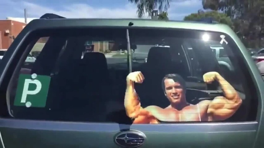 I muscoli di Arnold Schwarzenegger contro la pioggia. Guardate quanto è originale il tergicristallo sul vetro posteriore dell'auto.