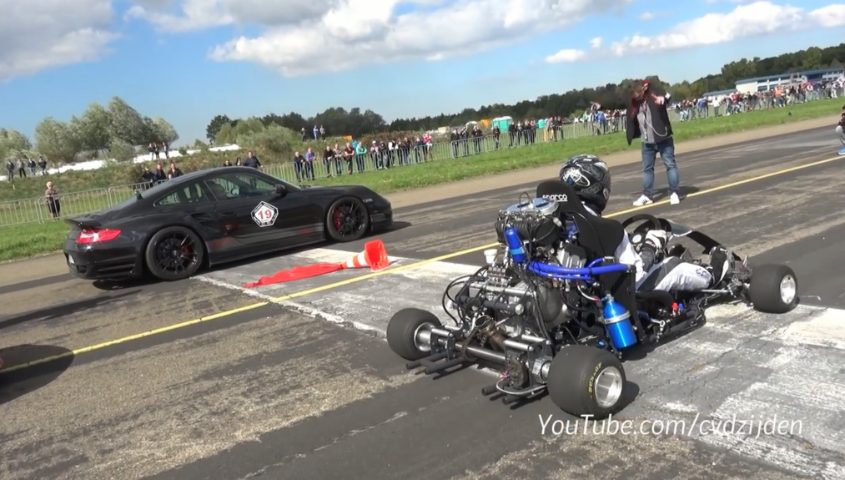 Insolita sfida tra un Go-Kart con motore Honda CBR1000RR e una Porsche 9ff: Il Super Kart ha un motore Honda CBR1000RR in grado di andare da 0-100 in 2,4 secondi, una sfida dunque tutt'altro che scontata.