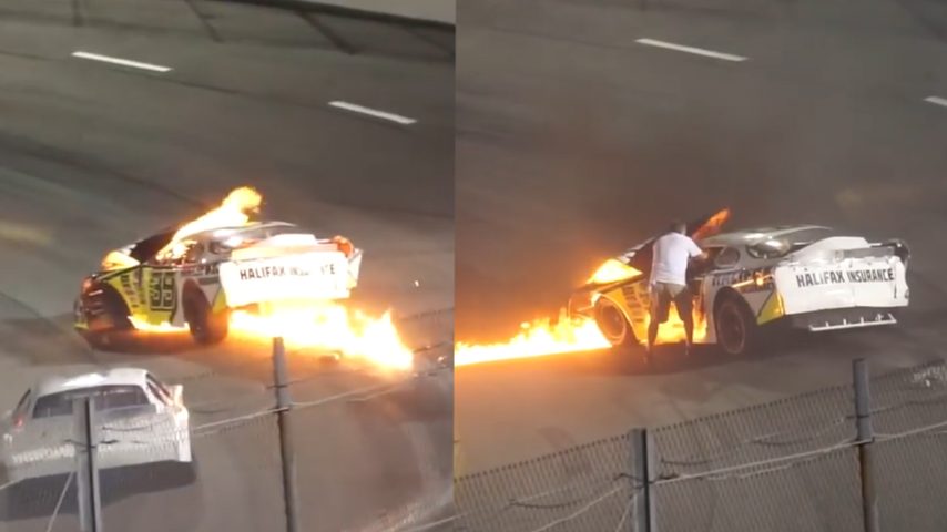 Pericoloso incidente durante una corsa automobilista a Boston. Due auto si scontrano facendo finire la Late Model sulle transenne, ma dopo alcuni metri l’auto prende improvvisamente fuoco. Il tempestivo intervento del papà del pilota Mike Jones, è fondamentale per tirarlo fuori e salvargli la vita.