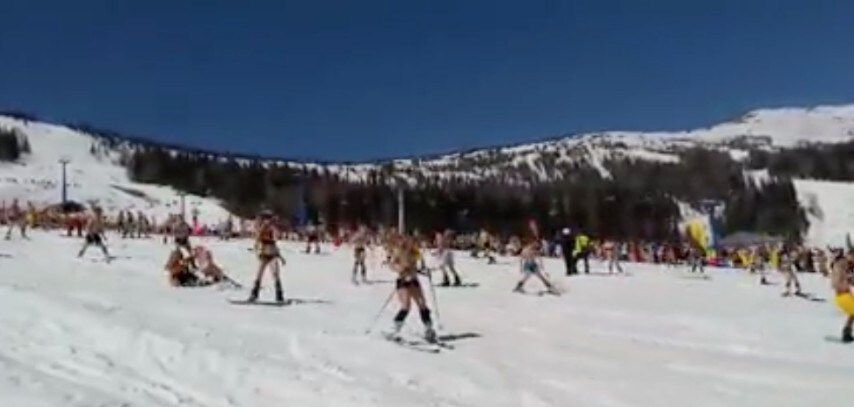 La scena proviene dal Grelka fest, un festival invernale organizzato in Siberia sulle piste del complesso sciistico di Sheregesh. La particolarità di questo evento è che i visitatori e partecipanti possono sciare in costumi e bikini e divertirsi in maniera incredibilmente diversa. I tantissimi scendono a bordo di sci e snowboard e si divertono tantissimo.Fonte: https://www.facebook.com/sheregesh/videos/1023985177731861/