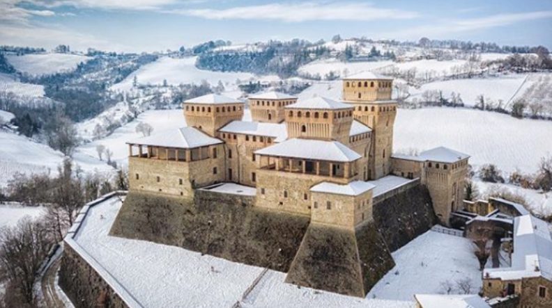 Il castello di Torrechiara completamente imbiancato: uno spettacolo immortalato dalle foto di tanti utenti e pubblicate sui social. È collocato sulla cima di un colle roccioso alle porte della Val Parma. È considerato uno dei più scenografici e meglio conservati castelli d'Italia. Dal 1911 monumento nazionale italiano, tutelato dal Ministero dei beni e delle attività culturali e del turismo in consegna al Polo museale dell'Emilia-Romagna, è inserito nel circuito dell'Associazione dei Castelli del Ducato di Parma, Piacenza e Pontremoli.