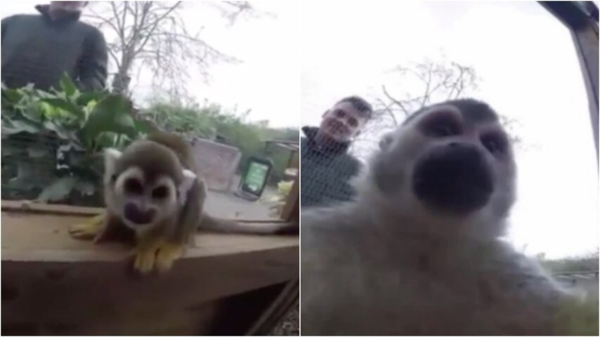 La scimmietta si accorge che il guardiano la sta filmando e gli "ruba" la telecamera
