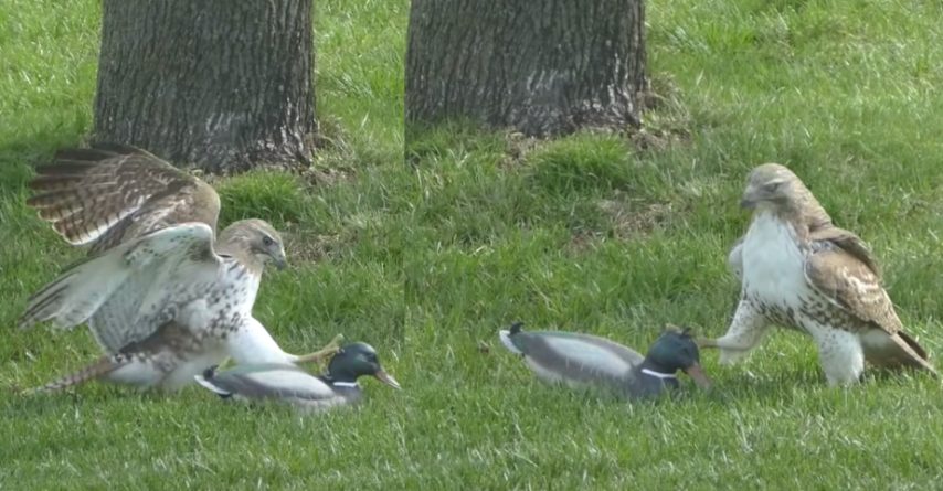 Un video per certi versi esilarante mostra la confusione di questo falco che abituato a vedere le sue prede scappare alla sua vista, questa volta resta perplesso. Il predatore dei cieli si avvicina all'anatra che resta immobile e le prova tutte, ma quell'animale non vuole proprio scappare. Il motivo? Semplice è di plastica ma il rapace non se ne accorge provando a più riprese a cercare una reazione in quella che crede essere un'appetitosa preda.