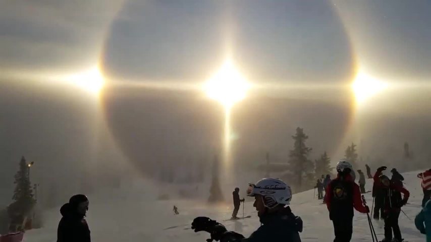 Sembra che in cielo ci siano 3 soli nella località di Vemdalen Ski Resort in Svezia. Due aloni si sono formati attorno al Sole, di cui uno estremamente luminoso e con 4 picchi alle 4 estremità del cerchi. Si chiamano "Pareli" e si formano a causa della rifrazione dei raggi solari attraverso minuscoli cristalli di ghiaccio in sospensione nel cielo. Il parelio si forma quando la luce del Sole penetra il cristallo di ghiaccio sospeso e ne esce con un angolo di 22 gradi. Il secondo cerchio, quello ai lati del primo, meno consueto e si forma quando la luce attraversa il pulviscolo ghiacciato in sospensione uscendo con un angolo di 45 gradi, ecco il perché l'alone è molto più debole.