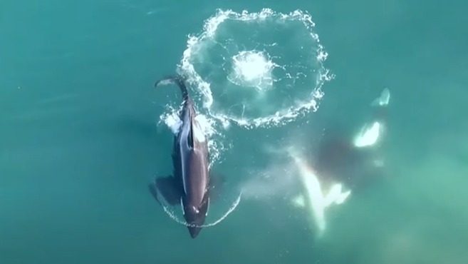 Un drone e un elicottero hanno documentato l'attacco di un gruppo di orche ad alcuni squali bianchi in Sudafrica. Uno è stato capovolto e ucciso con un morso potentissimo dietro le pinne pettorali, per far fuoriuscire il fegato. Si tratta della parte più ambita dai mammiferi marini. La predazione è stata documentata per la prima volta.