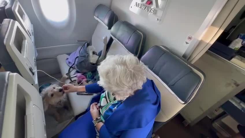 Il cane Honey tranquillo a bordo durante il suo primo volo in cabina