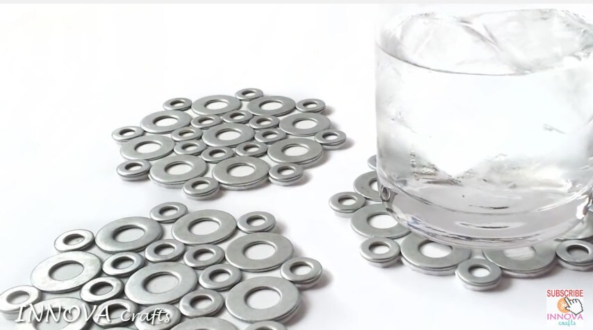 Delle anonime rondelle di metallo possono trasformarsi in un bellissimo oggetto per decorare la tavola! Prende diverse rondelle di varie dimensioni e le incolla tra loro creando la forma che preferisce. Il risultato è un perfetto porta bicchieri o sotto pentola! Fonte Video: https://www.youtube.com/channel/UC5R0wgIYygsLVRwaKtSSGVA