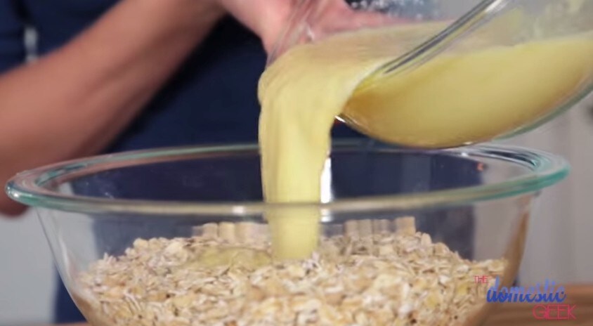 In queste immagini ecco il procedimento da seguire. Mescolare in una ciotola fiocchi d'avena, zucchero di canna, lievito e sale; in una ciotola a parte poi mescolare uova, succo di mela, latte e vaniglia. Dopodiché bisogna unire il tutto e far cuocere in forno a 375 ° C per 30 minuti.