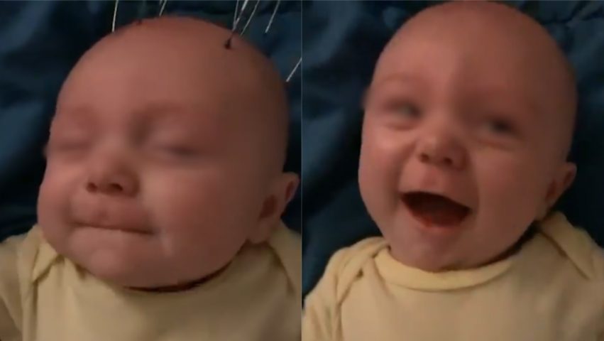 Il neonato piange disperatamente quando la madre tira fuori l'arma segreta: un massaggia testa. L'oggetto sembra calmarlo immediatamente e la faccia del piccolo diventa subito più rilassata.