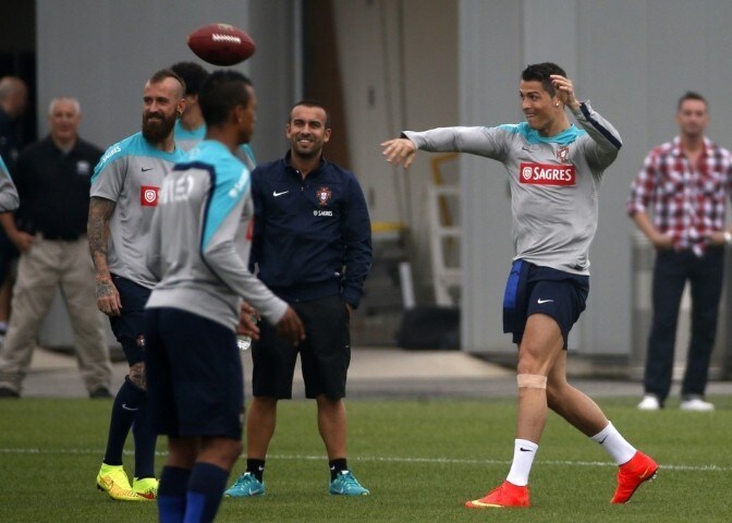 Il Portogallo si allena sul campo dei New York Jets e David Nelson, giocatore professionista della squadra professionista di football americano, si intrattiene con i giocatori del Portogallo e in particolare con Cristiano Ronaldo: guardate Cr7 come se la cava con la palla ovale...cosa ne dite?