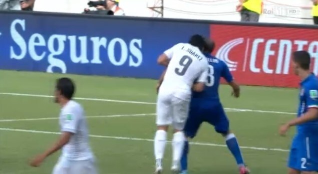 Luis Suarez morde sulla spalla Giorgio Chiellini durante Italia-Uruguay. Nessun provvedimento dell'arbitro che grazia l'attaccante.