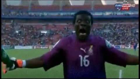 Al fischio finale, Abdul Dauda, portiere del Ghana, mostra tutta la sua gioia dinanzi alla telecamera per festeggiare la vittoria su Capo Verde e l'ingresso alle semifinali della Coppa D'Africa.