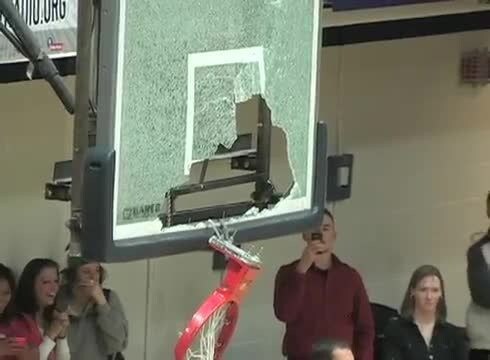 Una potenza della natura! Trevor Wages dei Colorado School of Mines mostra i muscoli e sfodera una schiacciata tanto vigorosa da distruggere il tabellone! Lui si mostra fiero della sua "impresa", noi invece ne siamo divertirti.