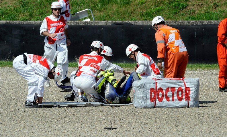 Una delle pagine più tristi della carriera sportiva di Valentino Rossi che il 4 giugno del 2010 è protagonista di un brutto infortunio: rottura scomposta ed esposta di tibia e perone della gamba destra.