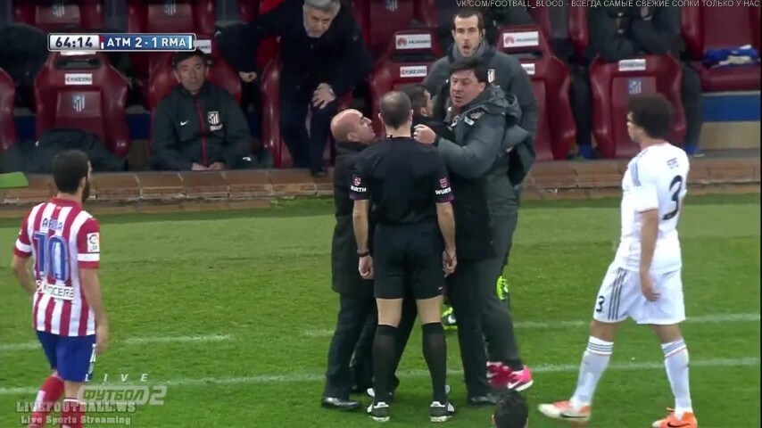 Germàn Burgos, assistente di Simeone, perde la testa e, durante la sfida tra Atletico Madrid e Real, dopo un fallo su Diego Costa in area, protesta a tal punto contro l'arbitro da mettergli quasi le mani addosso.