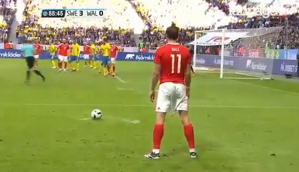 Il campione gallese Gareth Bale durante l'amichevole contro la Svezia prova una punizione direttamente in porta, da posizione molto defilata. Il calcio dell'attaccante del Real Madrid però esce fuori di moltissimo.