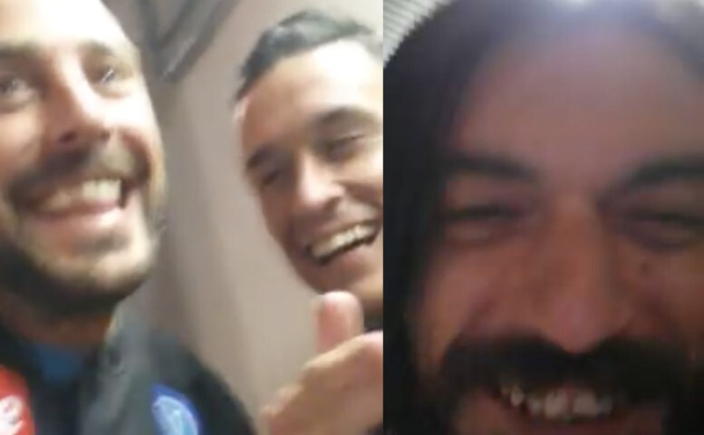 Siparietto negli spogliatoi del San Paolo al termine di Napoli-Bologna. Il comico di 'Made in Sud', Gino Fastidio, canta il suo famoso Steghedè con Callejon e Pepe Reina.