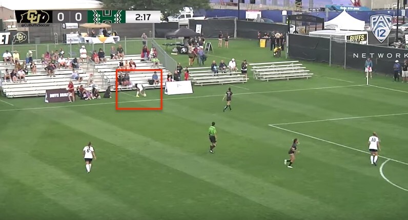 Anche nel calcio femminile è possibile ammirare giocate acrobatiche e mirabolanti. In una partita tra l'Università del Colorado e quella delle Hawaii, Danica Evans rimette in gioco da fallo laterale il pallone dopo una capriola: la sfera arriva direttamente in area di rigore dove la sua compagna Taylor Kornieck schiaccia in rete di testa.