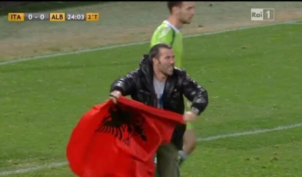 Un tifoso albanese entra sul terreno di gioco del Ferraris con la bandiera dell'Albania in mano. Corre verso il capitano Cana e gli chiede un autografo. Dopo l'invasore esce da solo dal campo.