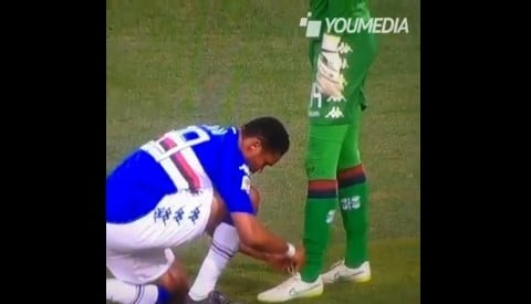 Gran bel gesto di Samuel Eto'o nel corso di Samp-Cagliari. L'attaccante allaccia le scarpe di Brkic nel corso del primo tempo.